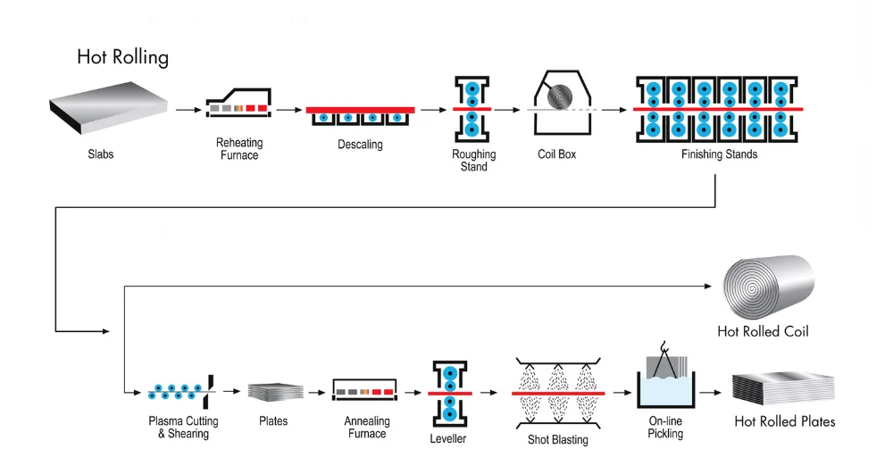 Hot-rolled coils, also known as hot-rolled coils, are strips made of slabs (mainly continuous casting slabs) as raw materials, which are heated by rough rolling mills and finishing mills. The hot steel strip coming out of the last rolling mill of finishing rolling is cooled to a set temperature by laminar flow, and is rolled into a steel strip coil by a coiler.
